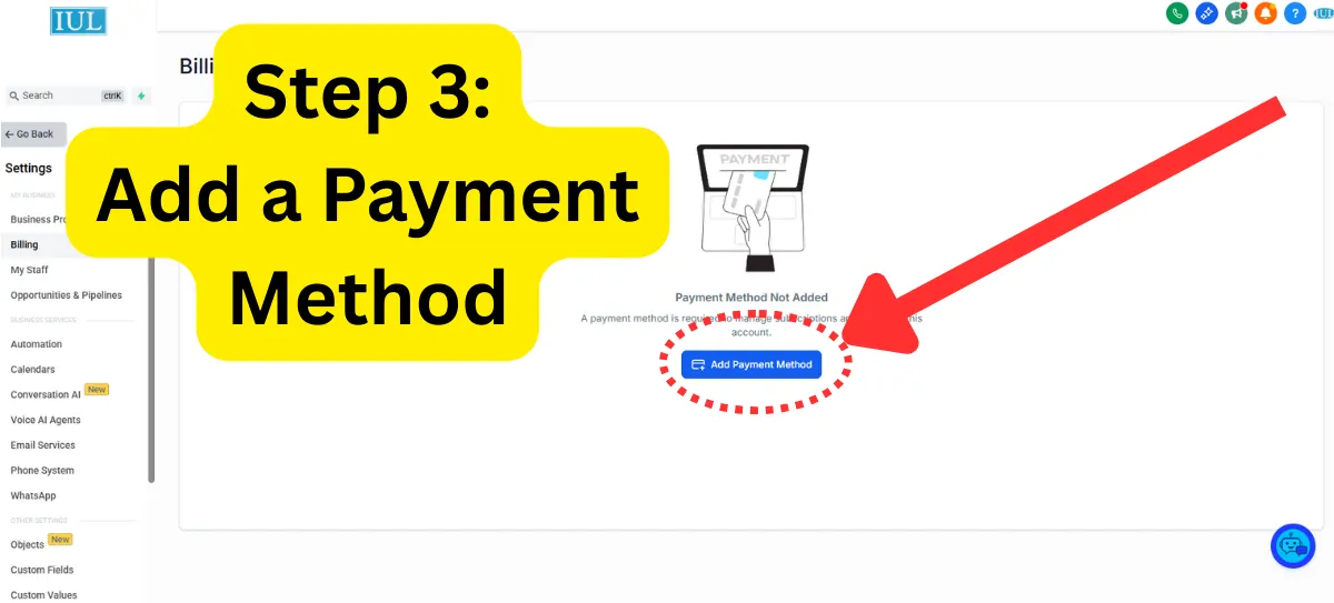 Settings > Billing > Add Payment
